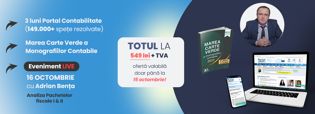 Nu uita: Oferta include 3 luni de acces complet la Portal Contabilitate, cu peste 149.000 de spete rezolvate si consultanta profesionala.